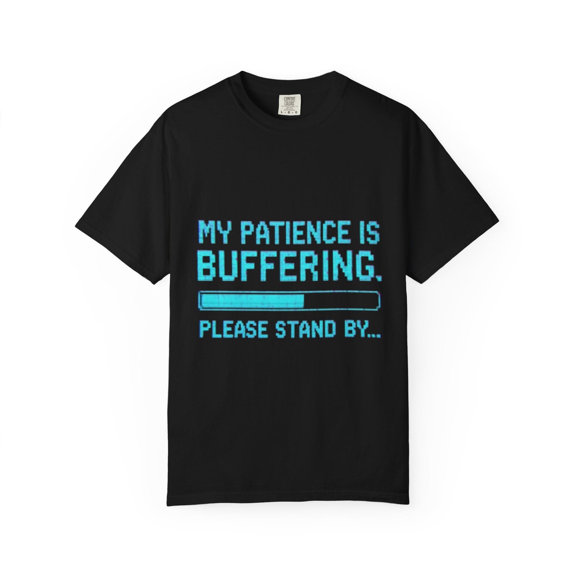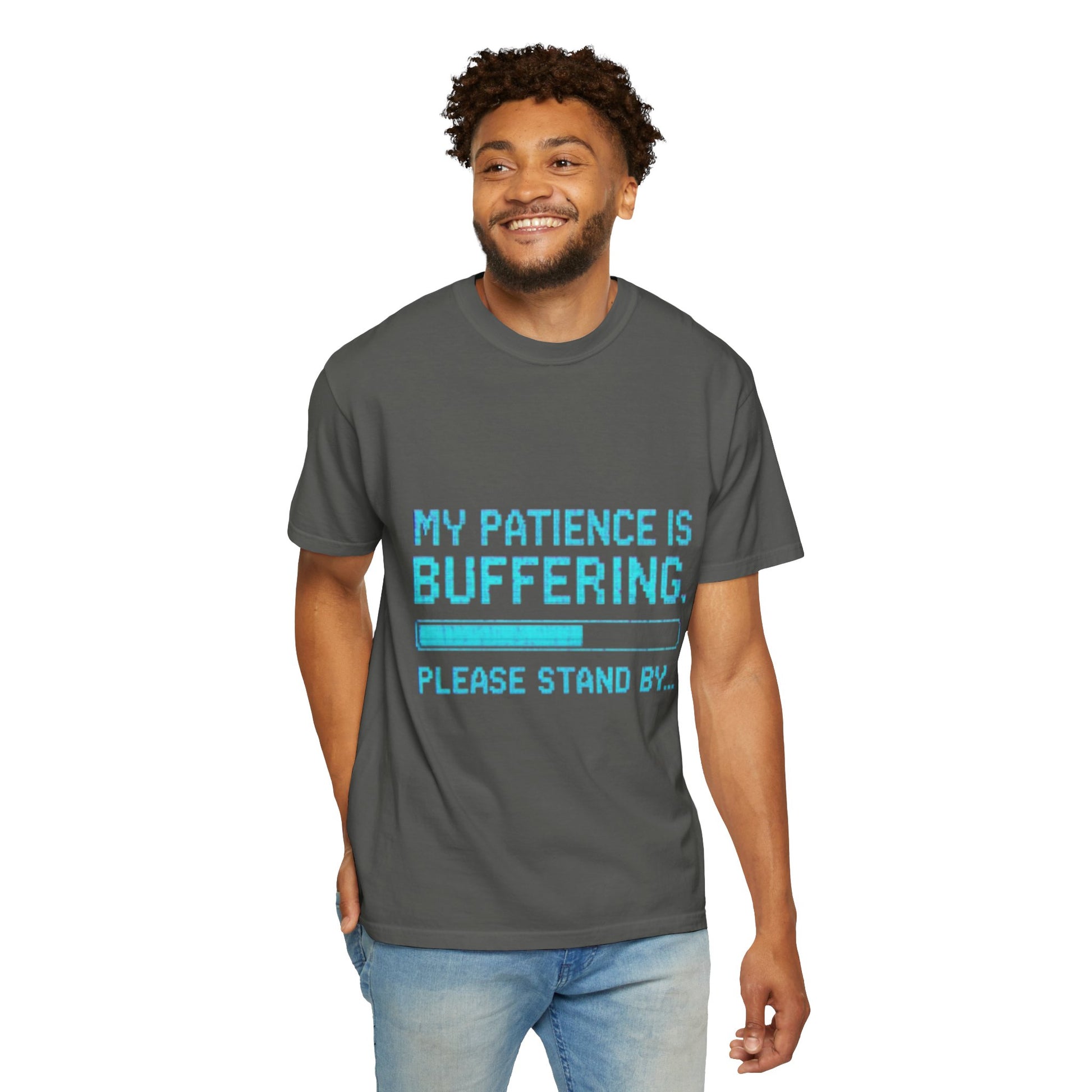 Introducing a fun and stylish Unisex T-Shirt, perfect for everyone who appreciates a touch of humor in their wardrobe. This tee features a playful design that reads, "My Patience is Buffering. Please Stand By..." making it an ideal choice for tech enthusiasts, gamers, or anyone who often finds themselves waiting. The soft garment-dyed fabric provides a laid-back vibe, perfect for casual outings or relaxed events. Suitable for year-round wear, this t-shirt makes an excellent gift for birthdays, anniversaries, or just to brighten someone's day. It's also a great addition to your wardrobe for themed parties and casual Fridays at work. Available in a wide range of sizes and colors, it's designed to fit comfortably in any lifestyle. Celebrate the joy of humor and comfort in this versatile tee.