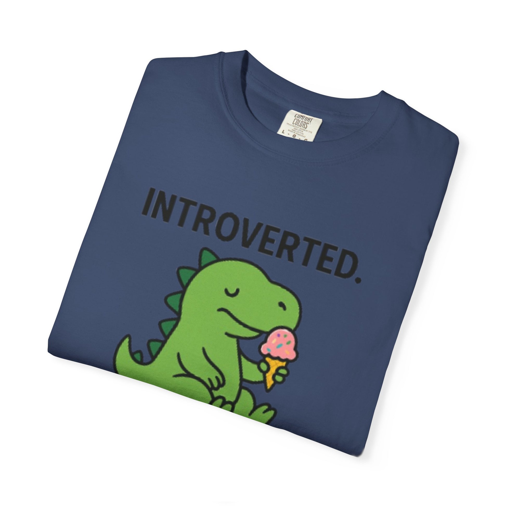 Introducing our delightful Unisex Garment-Dyed T-shirt, perfect for those who embrace their quirky side. This shirt boasts a charming dinosaur graphic that proudly states "INTROVERTED. WILL DISCUSS SNACKS," making it a fun conversation starter for introverts and snack lovers alike. Soft and comfy, this tee effortlessly fits into anyone's everyday wardrobe, whether you're attending a casual get-together or enjoying a cozy night in. Ideal for gifting during holidays like Christmas, birthdays, or even just to brighten someone's day, this shirt appeals to fans of humor and individuality. With its relaxed fit and classic crew neckline, it's suitable for all ages and pairs beautifully with jeans, skirts, or comfy lounge wear. Celebrate your unique personality with this standout piece!
